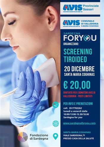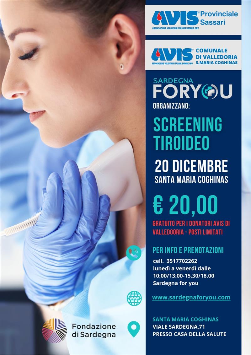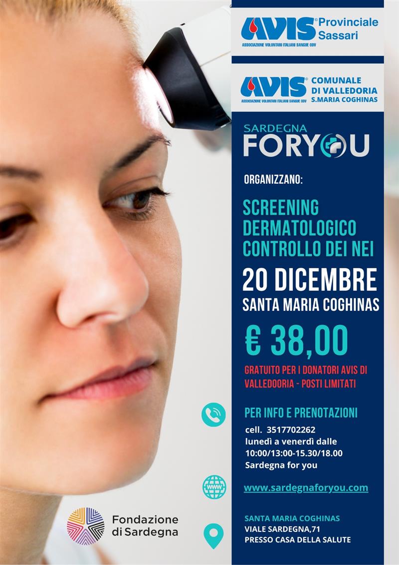 Il 2025 si concluderà con due appuntamenti fissati per il 20 dicembre a Santa Maria Coghinas, presso la Casa della Salute di viale Sardegna 71: screening tiroideo (costo di 20 euro per i non donatori) e screening dermatologico con controllo dei nei (38 euro per i non donatori). Entrambi saranno gratuiti per i donatori Avis di Valledoria- Santa Maria Coghinas, con posti limitati.
