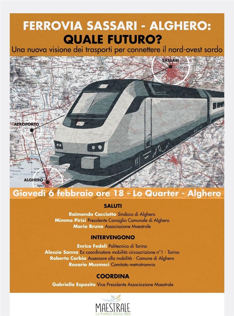 Un incontro-dibattito aperto a tutti per discutere il futuro della ferrovia Sassari-Alghero e del suo ruolo nel sistema di trasporto del nord-ovest della Sardegna. L'evento, organizzato dall'associazione culturale "Maestrale", si terrà giovedì 6 febbraio alle ore 18 presso la sala conferenze del Quarter, ad Alghero.
