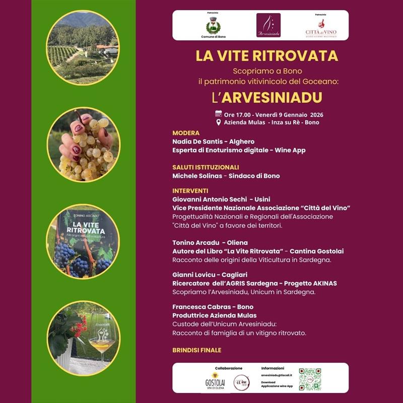 Venerdì 9 gennaio, a Bono, il Goceano si racconta attraverso uno dei suoi segni più profondi: un vitigno che per poco non è scomparso e che oggi torna a farsi voce del territorio. Alle 17, nell’Azienda agricola Mulas di Francesca Cabras, in località Inza su Rè, si terrà “La vite ritrovata. Scopriamo a Bono il patrimonio vitivinicolo del Goceano: l’Arvesiniadu”, primo evento interamente dedicato a questo vitigno autoctono raro, storicamente coltivato tra Bono e Benetutti.
