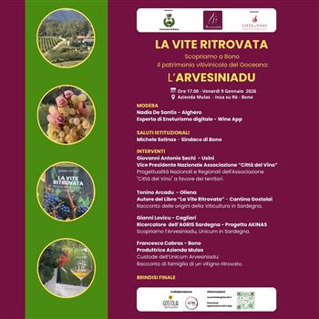 L’evento è patrocinato dal Comune di Bono e dall’Associazione nazionale Città del Vino. L’ingresso è libero e gratuito. Per informazioni: arvesiniadu@tiscali.it.